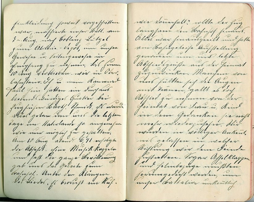 Gewehre und Seitengewehre in Empfang zu nehmen. Bis zum 10. Aug. verblieben wir in Oberlahnstein. Ich und mein Kamerad Paul Hein [1] hatten ein durchaus liebenswürdiges Quartier bei Zugführer Barth Schmidt. Es wurde alles getan um uns die letzten Tage im Vaterland so angenehm wie möglich zu gestalten. Am 10. Aug. abends 6.41 erfolgte die Abfahrt. Eine Musikkapelle und fast die ganze Bevölkerung gab uns das Geleit zum Bahnhof unter den Abklängen des Liedes "Es braust ein Ruf |