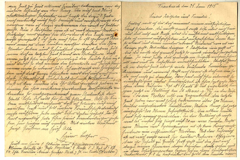 [ Ohne Umschlag ] Frankreich den 25. Juni 1915 Lieber Wilhelm und Familie ! Endlich will ich Dir doch einmal einen ausführlichen Brief schreiben. Du wirst gewiß recht böse über mich sein Und das auch mit Recht, aber Du musst mir entschuldigen habe ich immer aufgeschoben und aufgeschoben dann kam so etwas und wieder etwas anderes wie es im Kriege geht. Vor allen Dingen l. Wilhelm wie geht es Dir. Du wirst doch gewiß jetzt so weit wieder hergestellt sein. Ja wer hätte das gedacht im August vorigen Jahres als wir uns in Lahnstein verabschiedeten. Welches Elend ist in dieser Zeit über so viele tausende Familien ge- kommen und wie viel steht noch bevor ist doch an ein En- de noch nicht zu denken. Wir sind auch schon überall her- umgeflogen, unser Landwehrbat. ist schon sei zehn Wo- chen dem Reserve – Reg Nr. 17 als III Bat. zugeteilt. Lie- gen jetzt in Stellung bei St. Marie-a-Py in der Nähe von Souain- Perthes also im Hexenkessel. Die letzte Zeit haben wir viel Ersatz bekommen über 200 Mann, lauter ungedienten Landsturm. Unsere Komp. hat jetzt ungefähr 300 Mann Gefechtsstärke. Die alten Leute sind sehr wenig geworden. In der Stellung ist nicht viel los, unser Zug liegt auf 20 m [20 km ?] vom Feinde. Nichts wie Mienen und Sprengungen, es ist kein Krieg mehr, sondern ein raffiniertes Morden. Mit der Führung ist es auch nicht weit her, lauter Reserve – Offiziere, den ihr Gehalt zu Hause fort geht und die immer noch dazu einen schweren [Lohn] dazu beziehen. Diese gehen mit in den Schützengraben legen sich in ihren bombensicheren Unterstand 7-8 m tief unter der Erde. Die Leute wer- den dann vorn hingestellt wenigstens 150 m von ihnen entfernt. Das haben die Unteroffiziere über sich, die Herrn gehen nicht aus der Höhle machen noch lieber ihre Notdurft in eine Zigarrenkiste und lassen diese herausschaffen. Mich graut es manchmal wenn ich daran denke es ginge mal los dann wäre keiner zu finden. Man rechnet damit, daß es hier in der Champagne unter der Hand mal wieder losgeht wenn man so die Zeitungen ließt von dem Mute und der Tapferkeit unserer Truppen kommt es einem manchmal ganz komisch vor, es ist das liebe Muß, sie sind es alle satt und wären froh wenn es Schluß wäre. Unser 3. Bat. ist dem Res. Regt . 69 als 3. Bat. zugeteilt und unser 1. u. 4. Bat. hingen in den Vogesen, ganz zersprengt und verstreut. Wir hier der Stellung liegen wir bei Cernay na dem 15. Reserve – Korps auch na dem 80ern. Da habe ich K. Sanner, E, Faust aus Selters , sowie K. Sahm aus Maxsein öfter getroffen, auch habe ich meinen Schwager Ostern besucht und Emil Schnug getroffen, sowie die beiden Aller [Anm.: "Aller" ist ein Familienname] aus Maxsain, die wissen nicht was Krieg ist. Bei uns sind auch noch mehrere Selterser [Anm: Amt Selters] Jahn v. Grenzau, W. Groß, K. Faust, K. Hein, welchen Du auch kennst er ist zwar bei der Bagache auch Unteroffizier Götsch aus Grenzhausen, der hat ein großes Nummer bei der Bagache und ist sehr ein- gebildet weiß nicht ob er mit einem gewöhnlichem Mann sprechen soll. Im März war ich auch zehn Tage im Lazarett in Rethel wurde aber schnell entlassen, das drücken [Drückeberger] versteht nicht ein jeder, ob- wohl tausende von dieser Sorte hinter der Front |